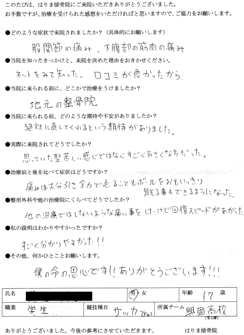かかりつけ整骨院で治らず大会直前に思い切ってこちらにかかったら半年以上悩んだグロインペイン症候群が3回の通院で快復し、試合に出場でき兵庫代表になれました。