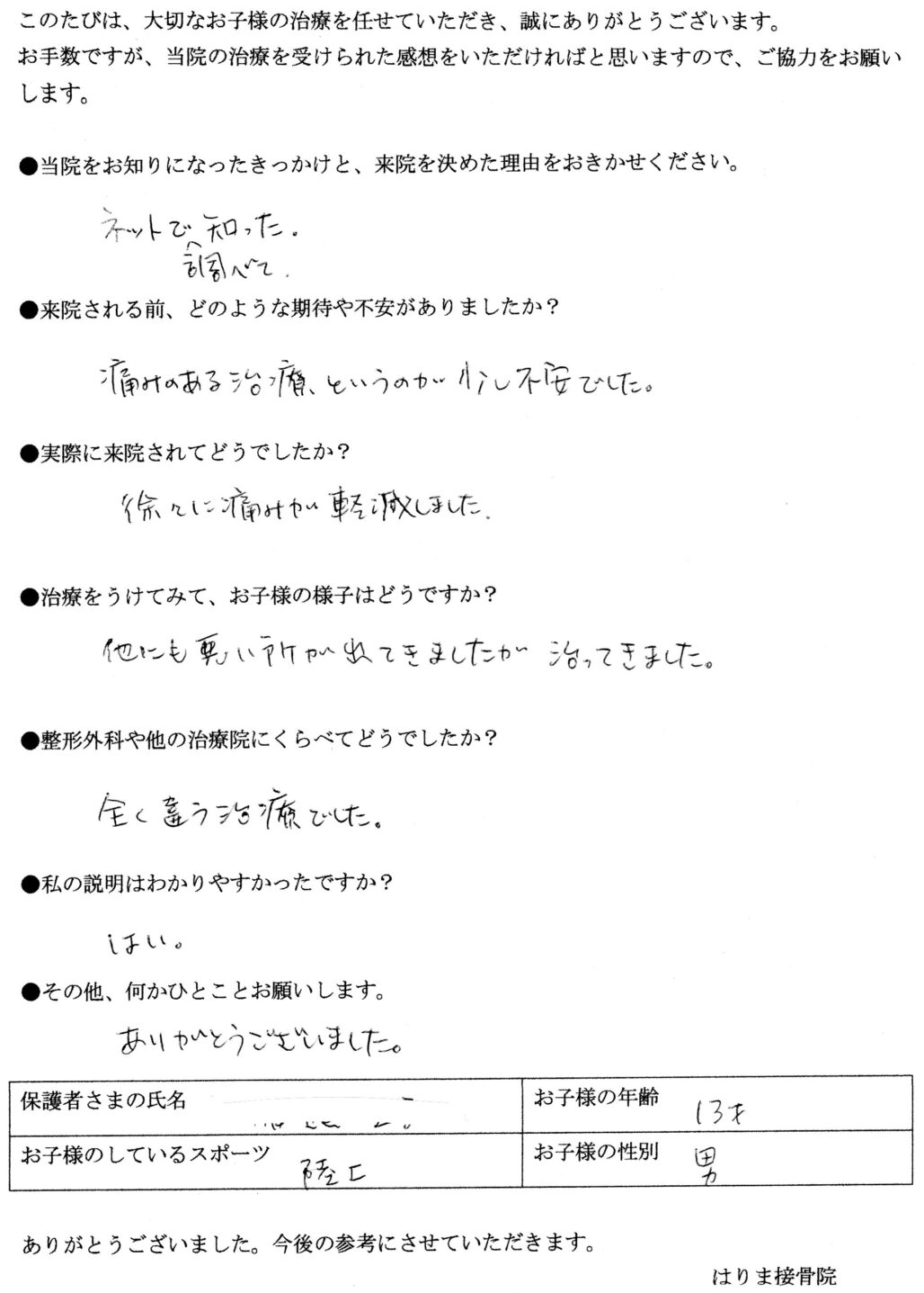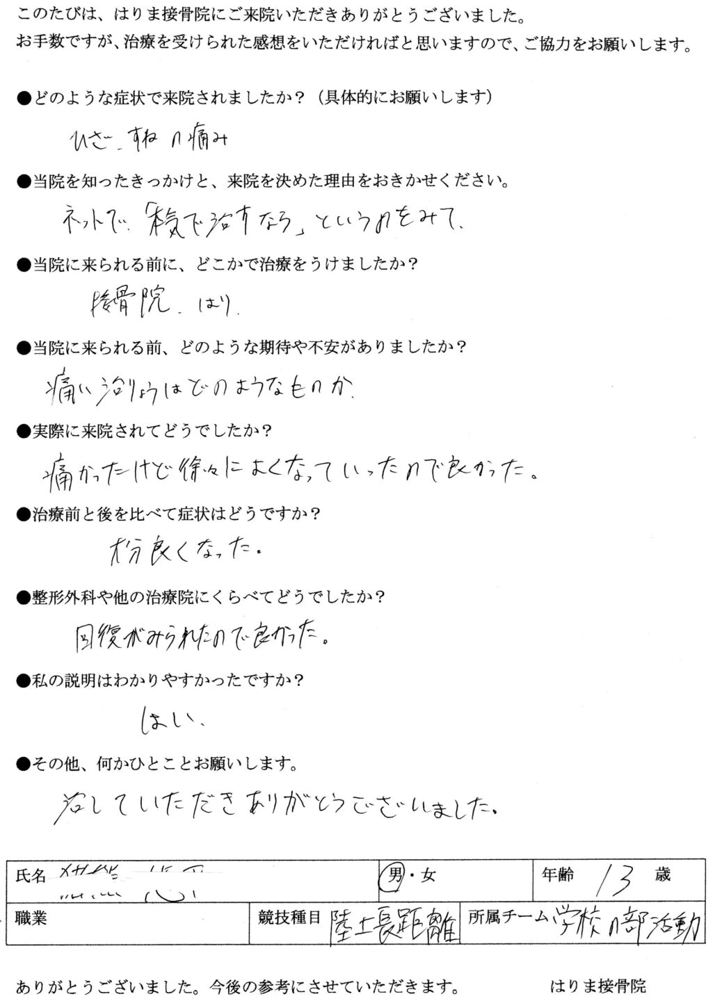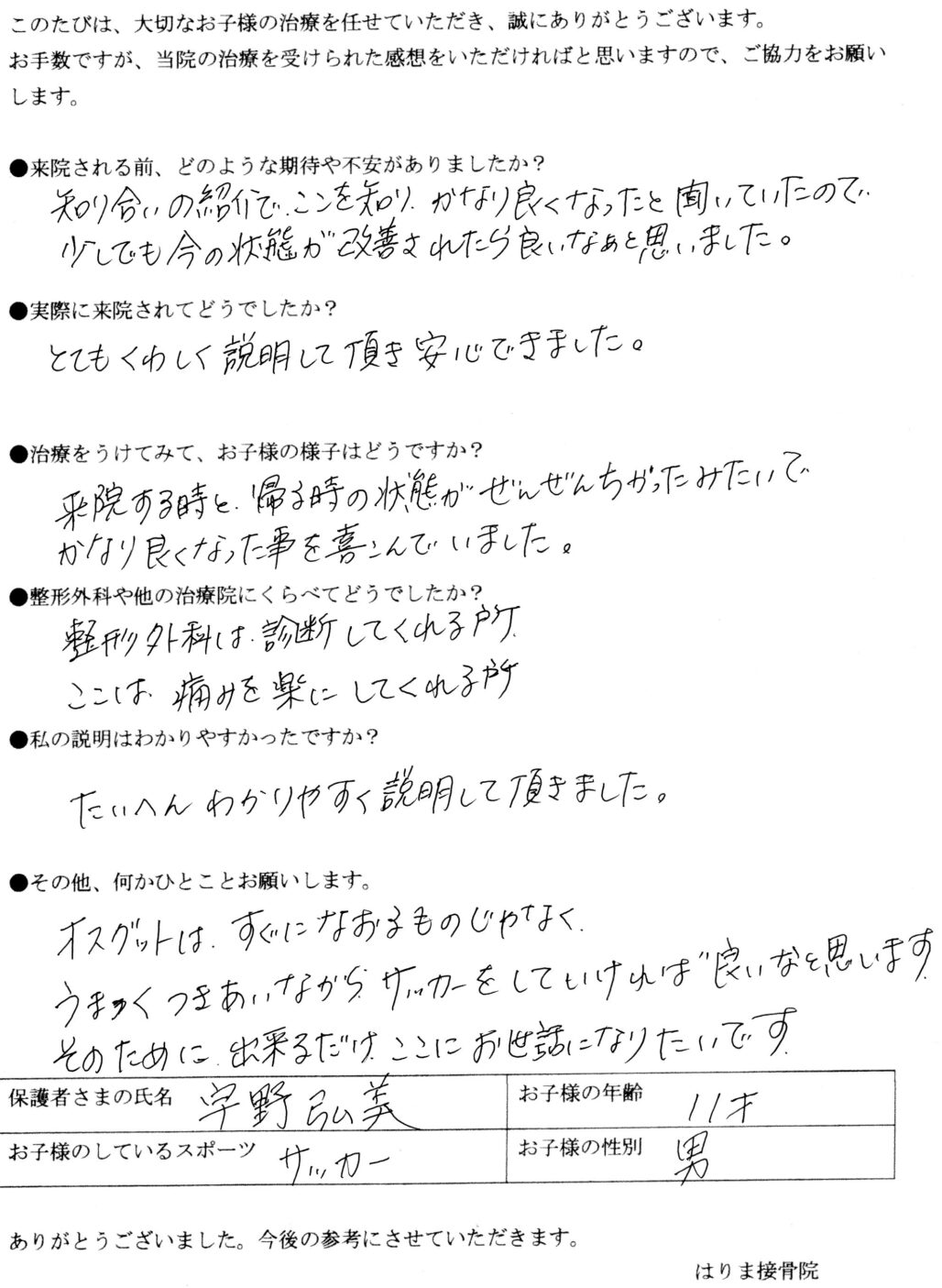 残念ながら1回で解決とはいきませんが、できるだけ早くお子さんがオスグッドの痛みから解放され、笑顔で部活動に復帰できるよう、最後まで諦めず施術することをお約束いたします。