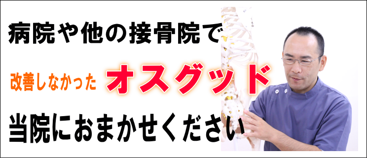 当院には「病院では成長痛だから仕方ないと言われた」「何ヶ月も通っているのに良くならない」というオスグッドに悩むお子さんと保護者の方が多く来られます。