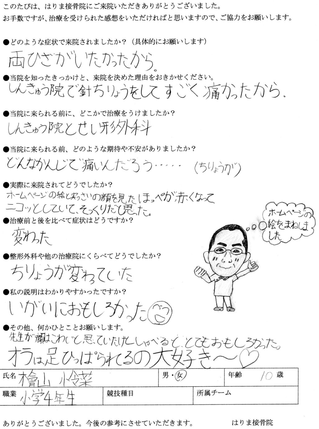 施術中は、手に汗を握って痛みをガマンしていましたが、施術後は痛みが無くなり、嬉しそうに走っていました。